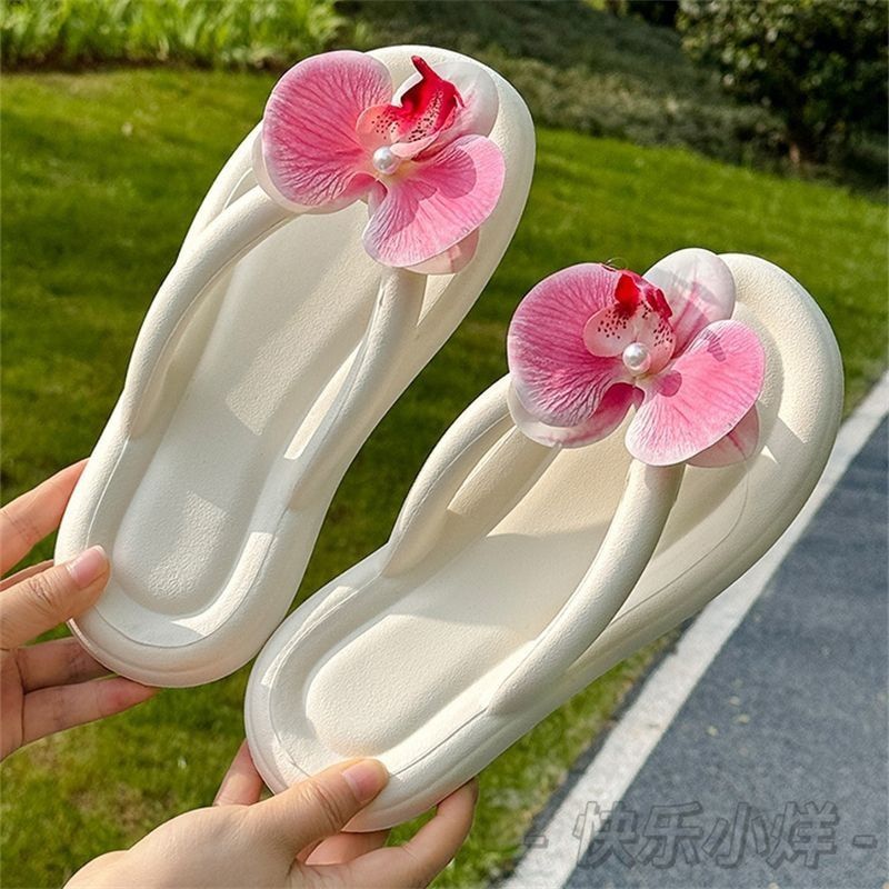 Mẫu dép mang thiết kế nữ tính, nổi bật với chi tiết hoa lan 3D màu hồng pastel được gắn tinh tế trên quai dép. Phần hoa có độ nổi nhẹ, tạo điểm nhấn sang trọng nhưng vẫn giữ được vẻ dịu dàng, thanh lịch.